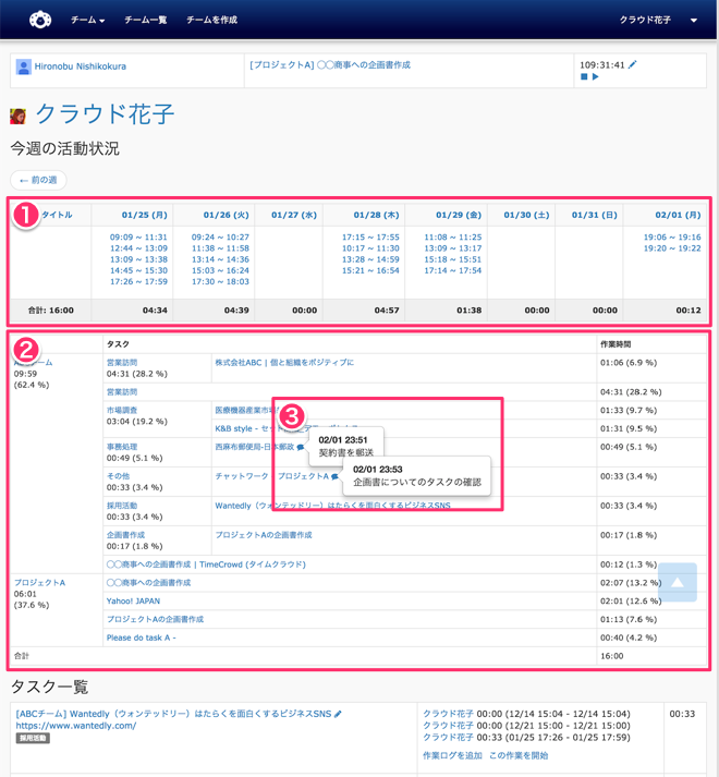 ② 日単位での稼働状況と、タスク単位で合計された稼働状況を確認できます。